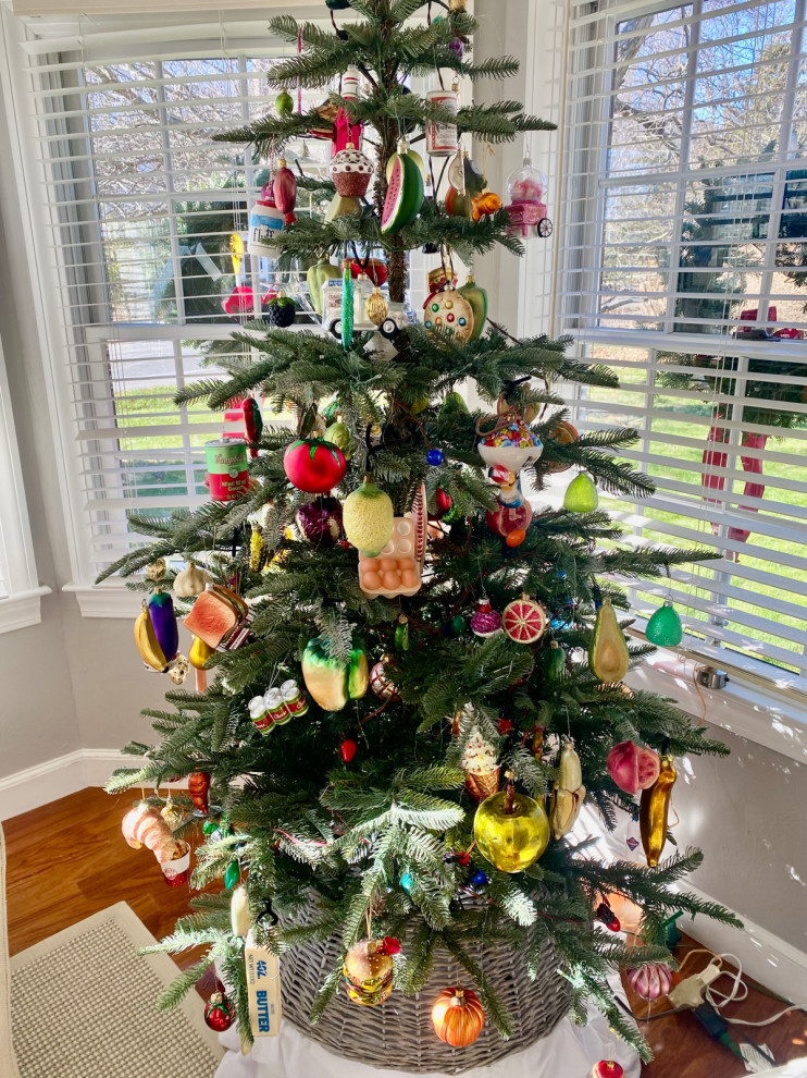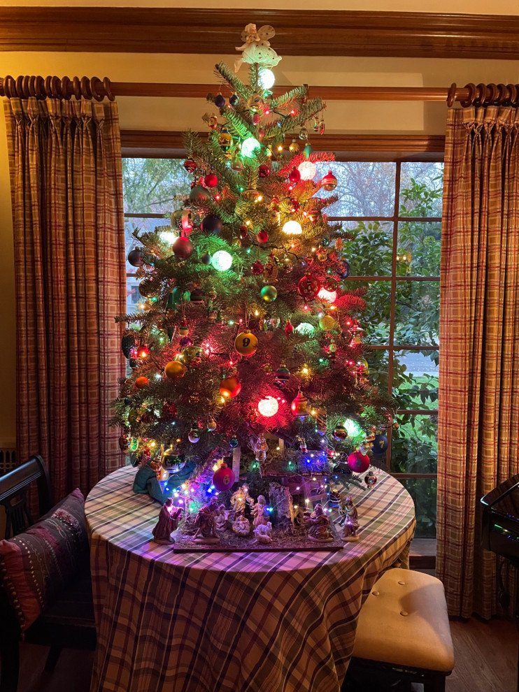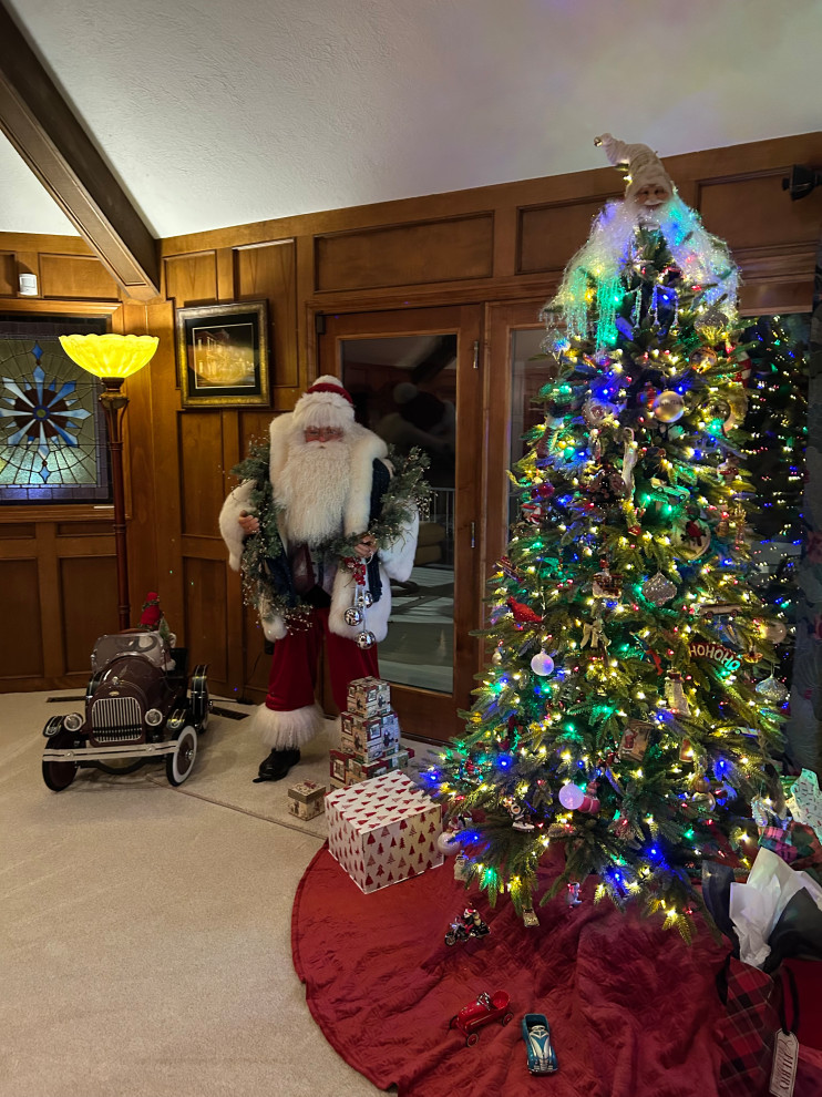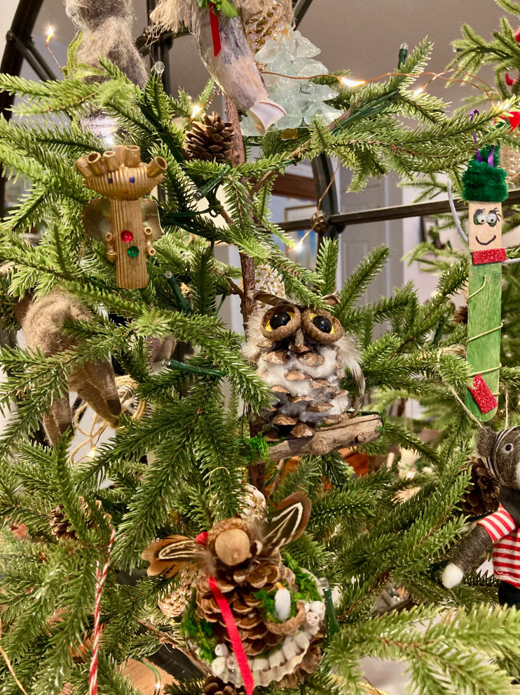 “The Santa has stood next to our tree since the passing of my husband’s dad in 2012,” writes Houzz reader dlitt. “We had it made by a local artist. The fur coat was his mother’s, the glasses and scarf were his dad’s. Santa stands 6’ tall. The tree is decorated with ornaments collected through the years and from my parents’ home after their passing in 2015.”