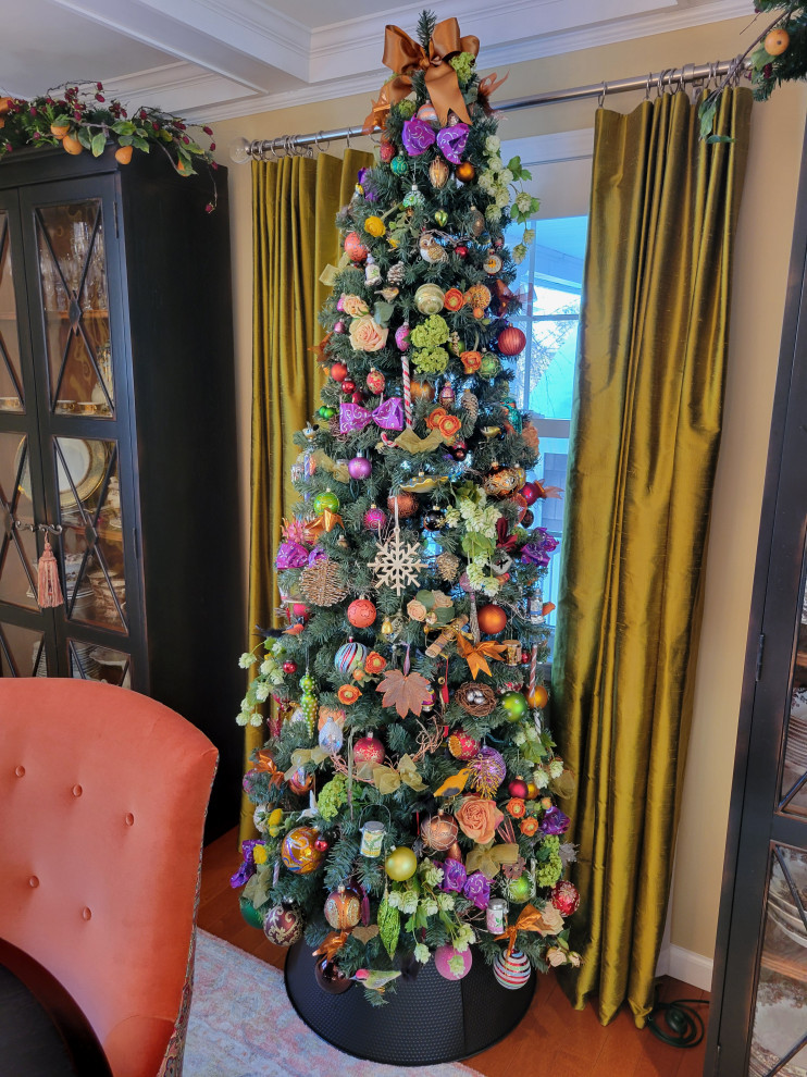 Houzz user steve61ct’s trees coordinate with their settings. This one is full of unexpected colors like chartreuse, violet and deep apricot, which play off the furniture and accessories in the dining room.