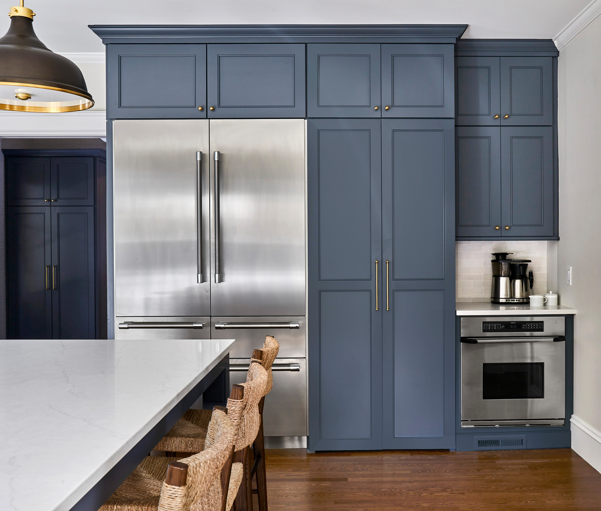 In addition, the homeowners already had this second oven and knew how handy it would be when hosting big holiday meals. Martel placed it along this wall and knew the area above it was the perfect place for the coffee station. She also scrapped the standard pantry door, as it chopped up this wall and made the fridge stick out like a sore thumb.