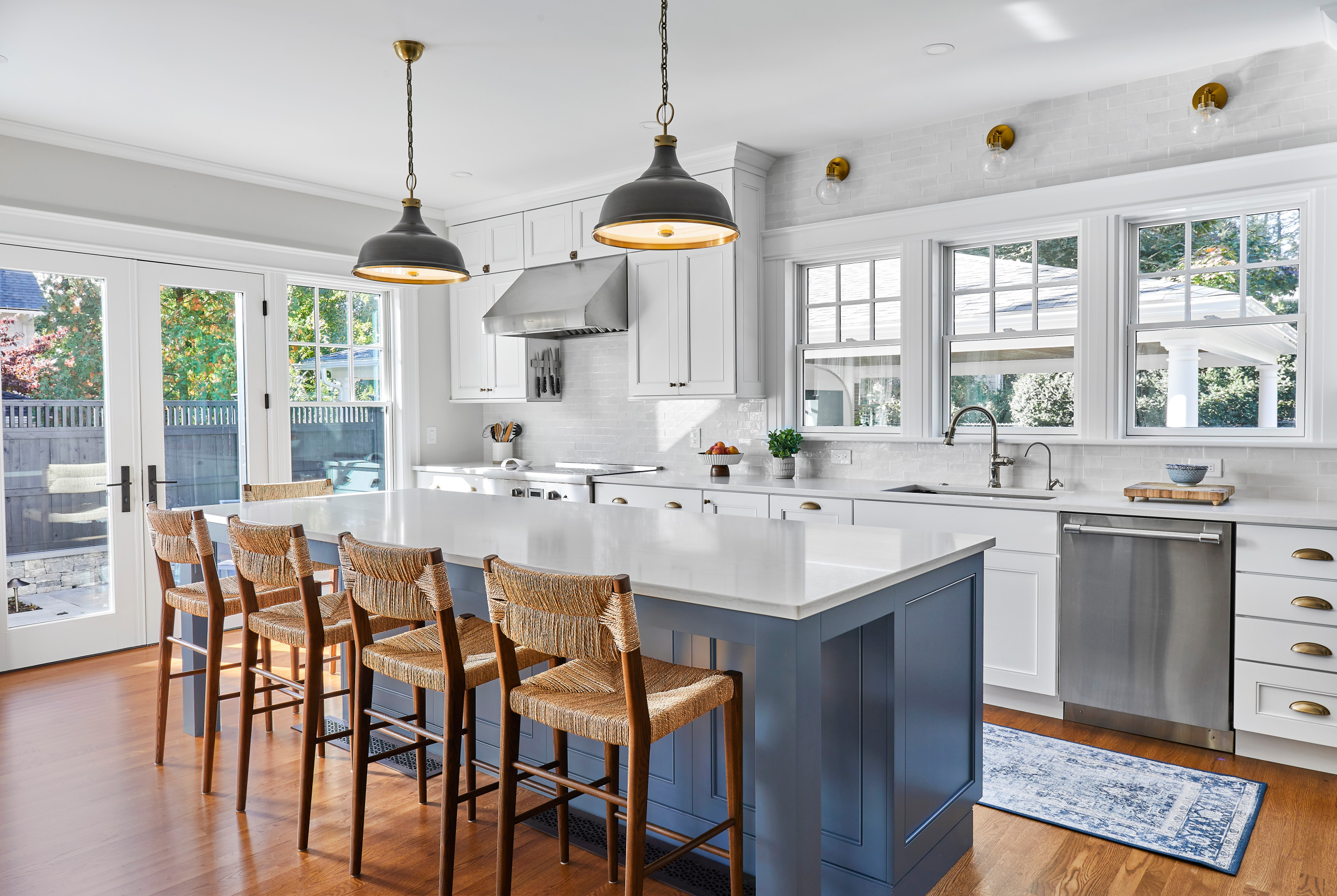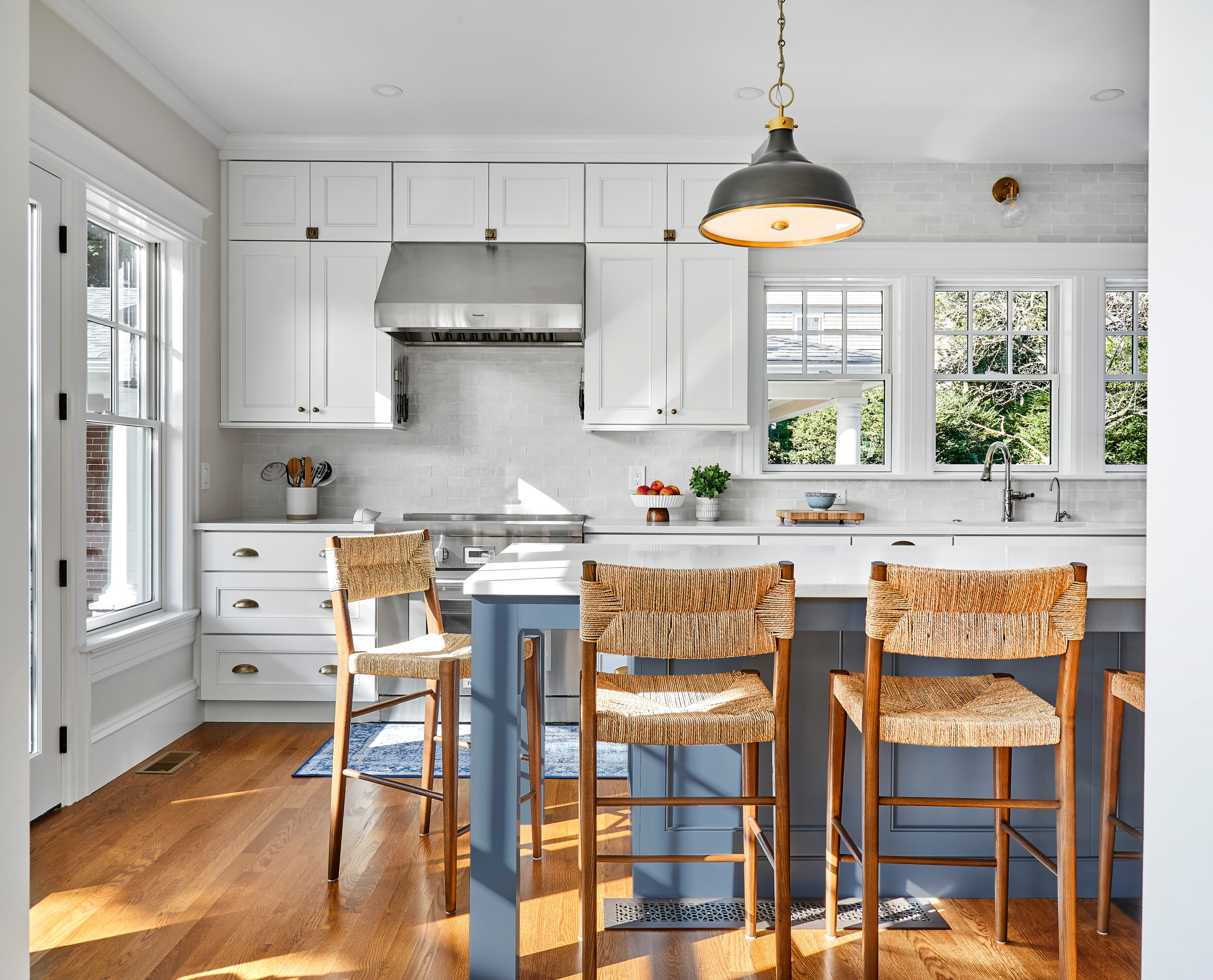 Today, the remodeled kitchen functions as the heart of the home, offering ample space for family meals, homework sessions and keeping the cook company. It connects seamlessly to the mudroom, dining room and backyard, supporting the rhythms of daily life. Durable materials such as quartz countertops, woven stools and a patterned runner stand up to the demands of a busy household, while thoughtful vintage-inspired details ensure the kitchen feels right at home in its historic setting.