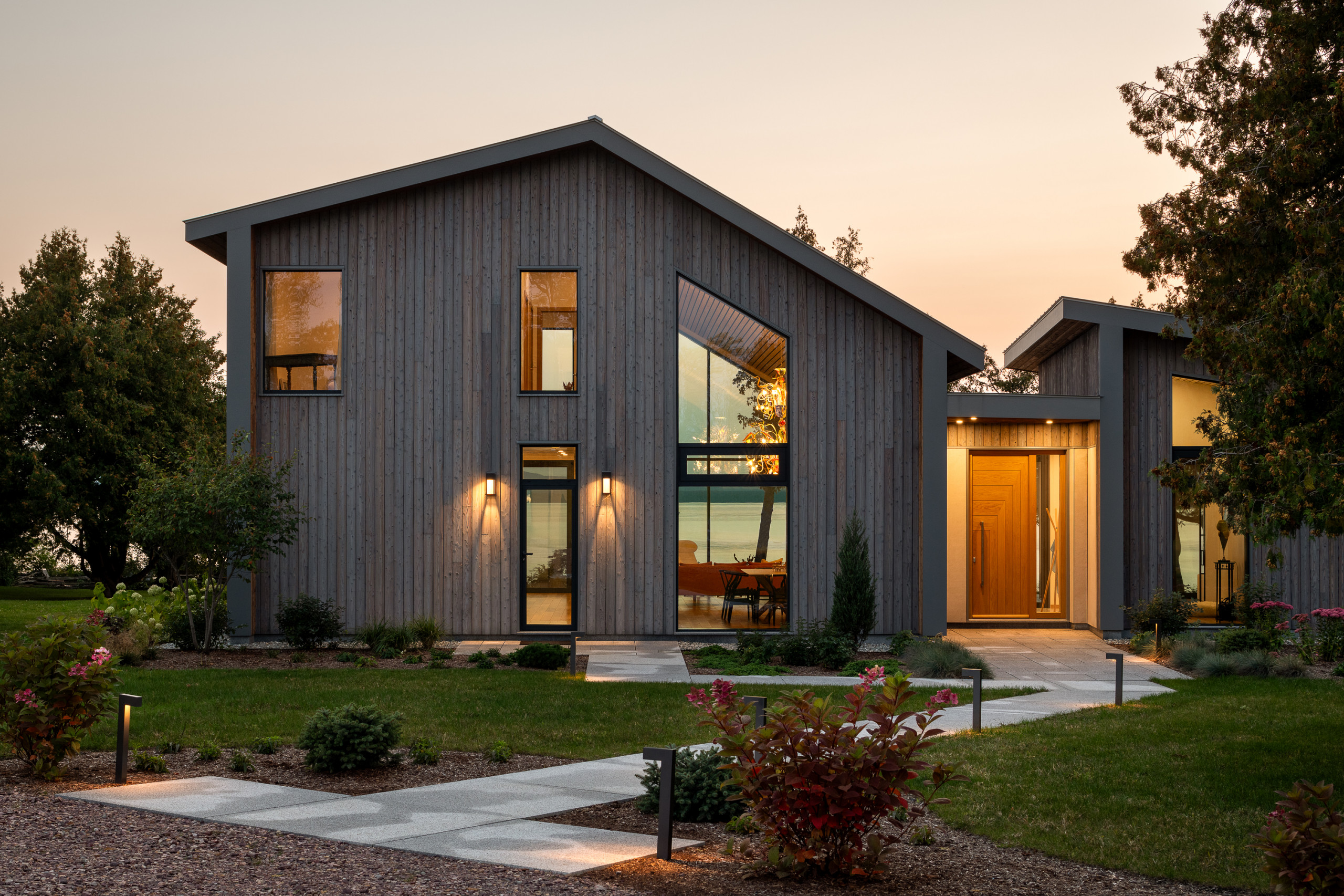A mix of stone, dark siding and warm wood ties this contemporary Wisconsin home to its lakeside setting. Classic Custom Homes of Waunakee designed a dramatic facade featuring angled rooflines and large windows with varied muntin patterns, creating dynamic visual interest.