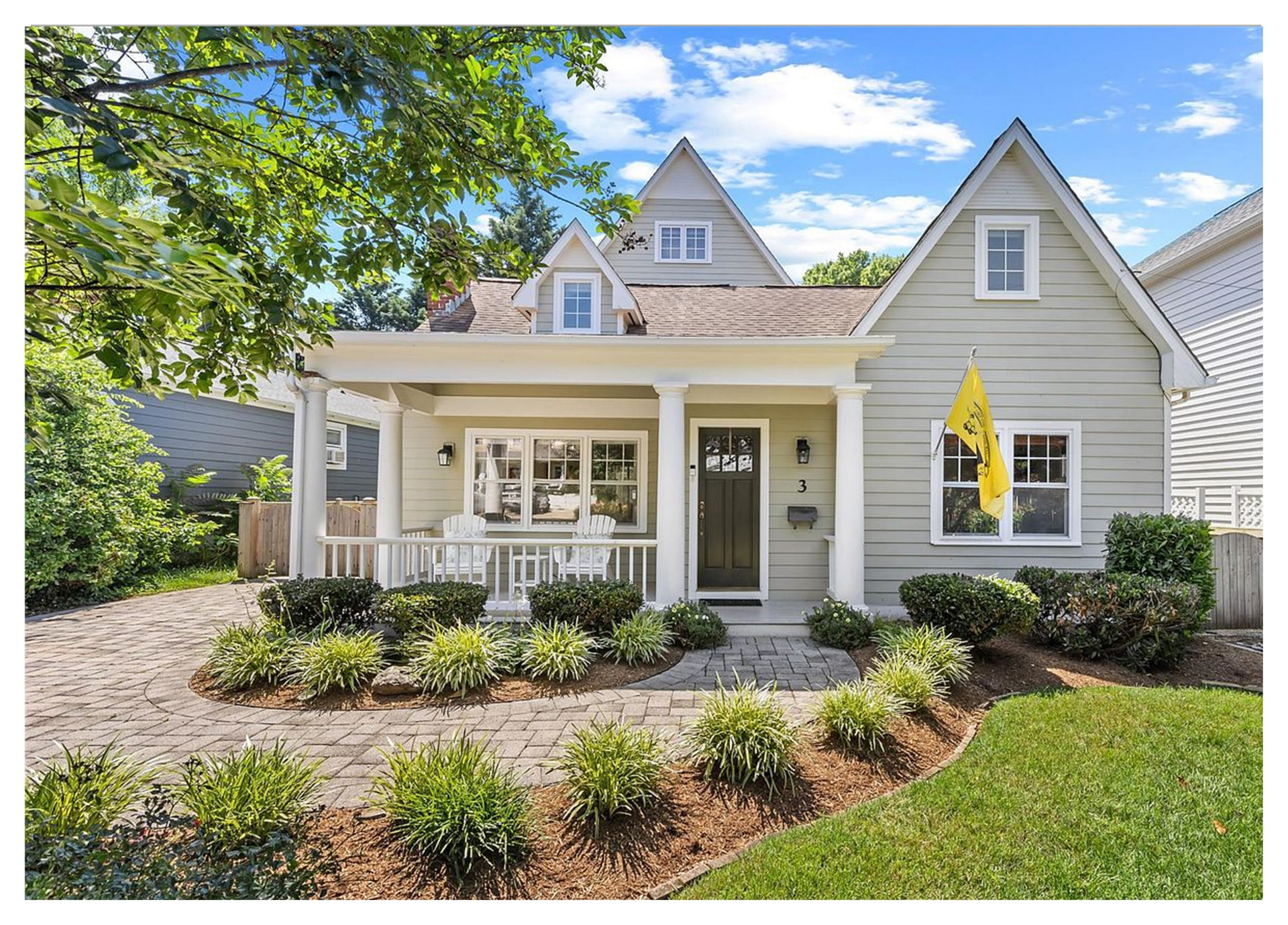 Multiple gables, a welcoming front porch and meticulously tended landscaping give this Annapolis, Maryland, home by designer Gina Fitzsimmons abundant cottage charm. Details such as Doric columns, louvered pediments and cobbled paving further enhance its inviting, storybook look.