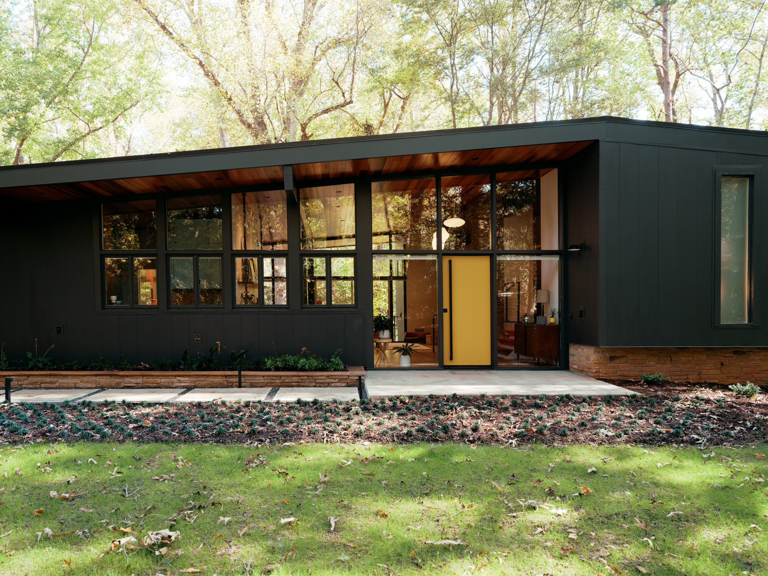 A previous renovation’s vinyl siding had hidden deteriorating wood and dulled the charm of this 1961 Greenville, South Carolina, split-level. Designer Brittany Arnold of Ario Studio replaced it with textured aluminum in deep charcoal (Iron Ore by Sherwin-Williams) and added a black standing-seam metal roof. A slab-style door in gold (Ceremonial Gold by Sherwin-Williams) with an elongated vertical handle and a poured-concrete paver pathway create a striking entryway. Unkempt plantings were removed, while the home’s distinctive pivot-slide windows were preserved. The midcentury home now makes a bold, stylish statement on its leafy lot.